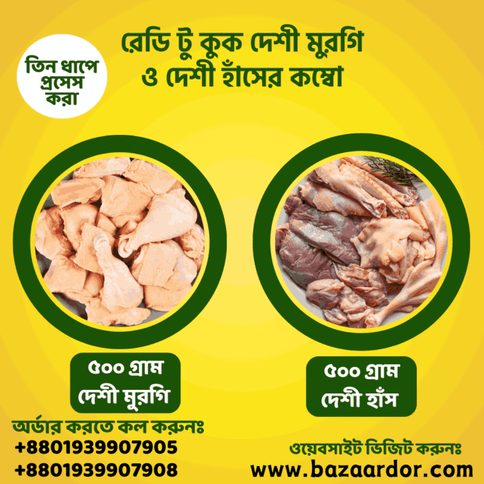 বাজার ফ্রেশ রেডি টু কুক দেশী মুরগি ও দেশী হাঁসের কম্বো প্যাক ৫০০ গ্রাম প্রতিটি ± ৫০ গ্রাম – ১ কেজি